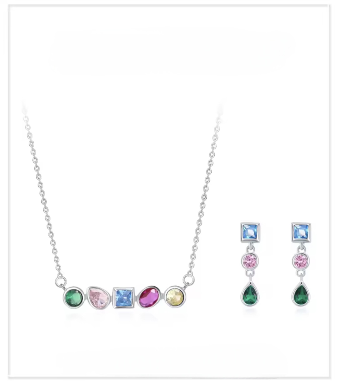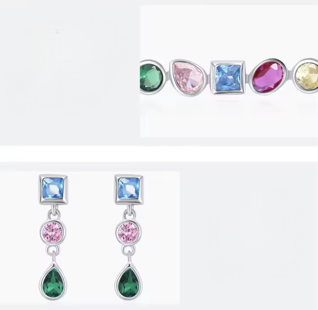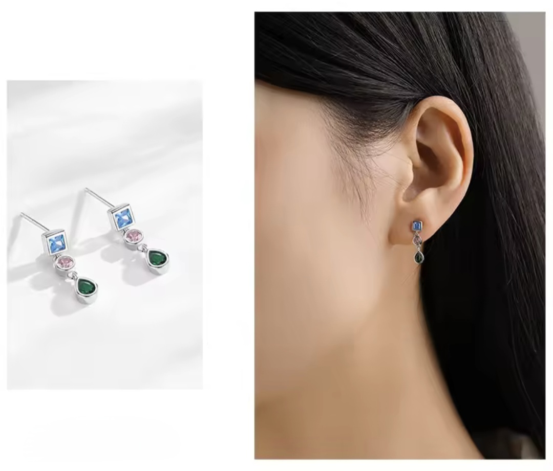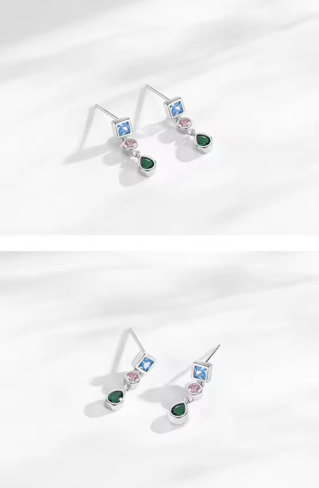 Висящи сребърни обеци с цветни цирконии, които добавят нежен блясък и свеж цвят към всяка визия.